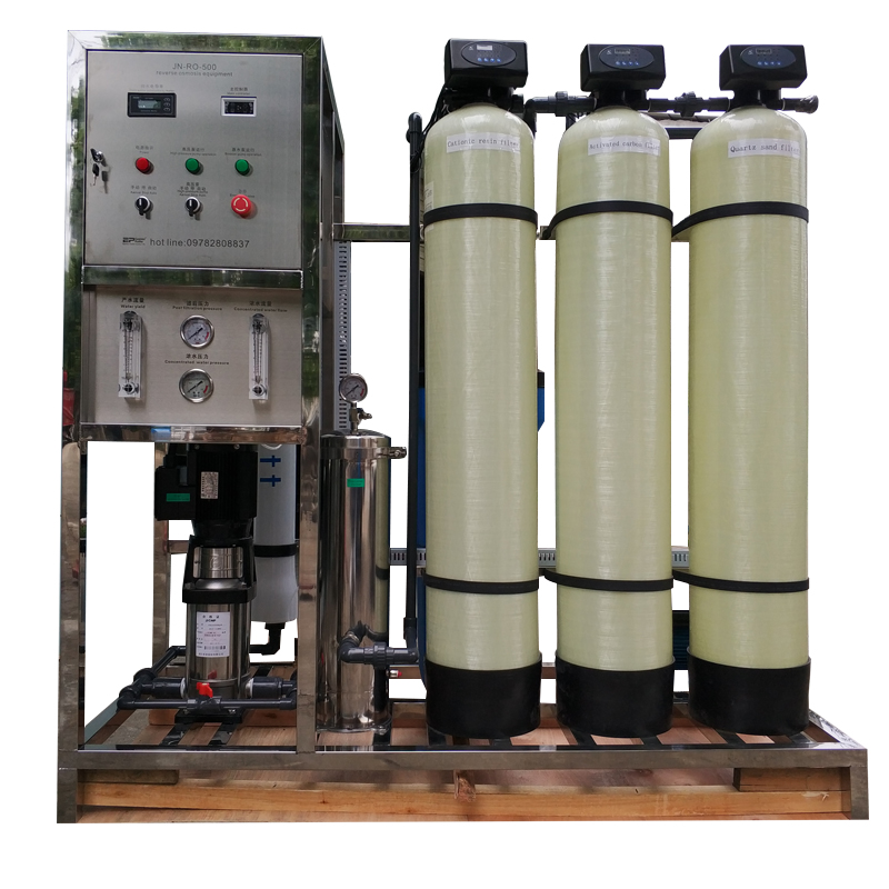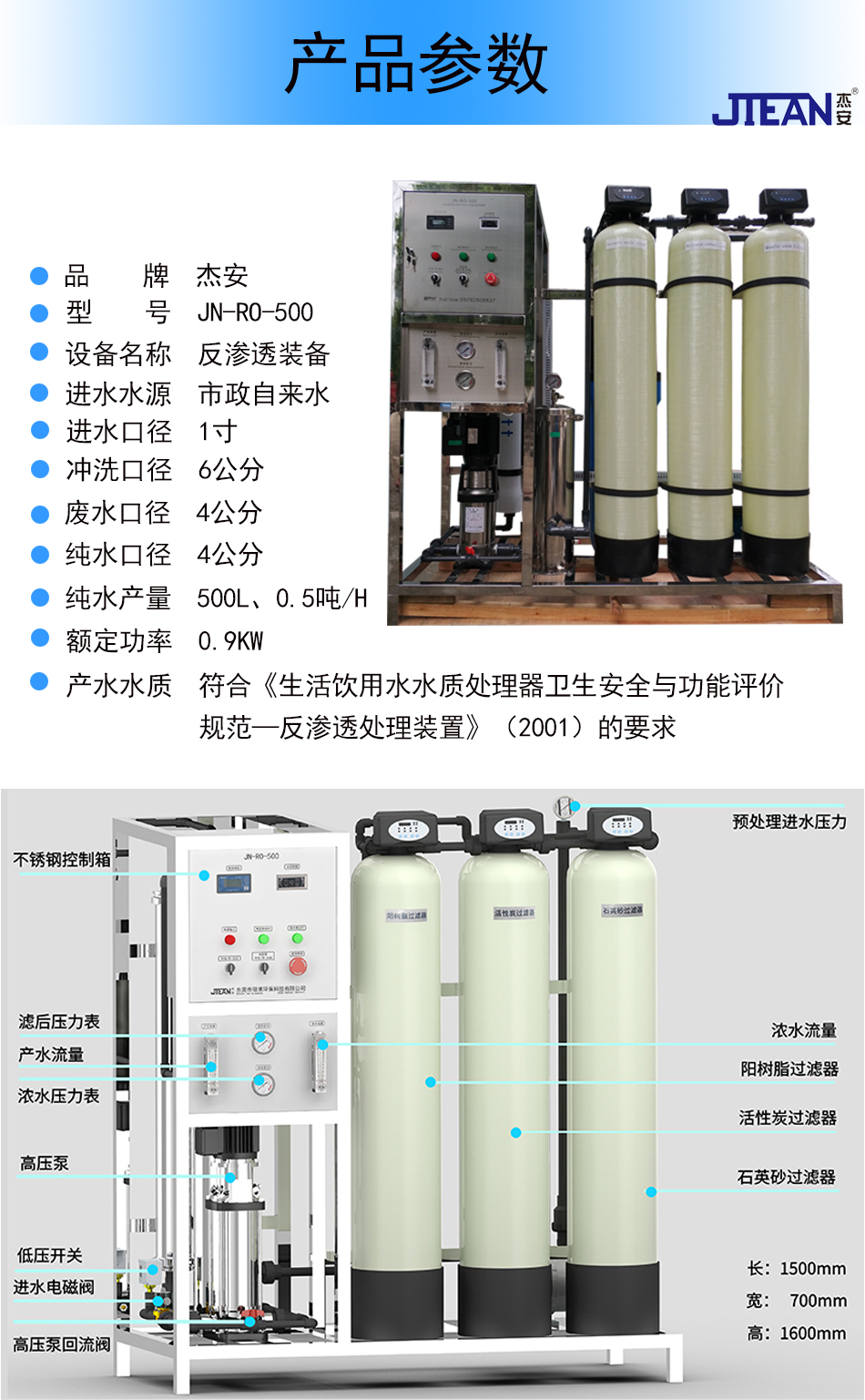 产品型号 JN-RO-500 产品尺寸 160cm *150cm * 70cm 产品重量 260KG左右 进水口径 6分 出水口径 4分 浓水口径 4分 额定功率 3.3KW 电压 220V 产水量 0.5T/H